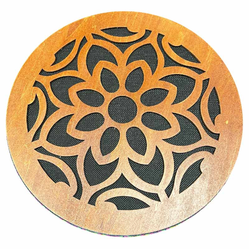 Каркас инструмента изготовлен из натурального дерева, что не только придает ему прочность и долговечность, но и создает эстетичный вид с приятной текстурой. Верхняя крышка имеет фигурную лазерную вырезку в форме цветочного орнамента, что придает изысканности и позволяет видеть внутреннее наполнение. Такой дизайн сочетает практичность и декоративность, превращая инструмент в стильный элемент интерьера.