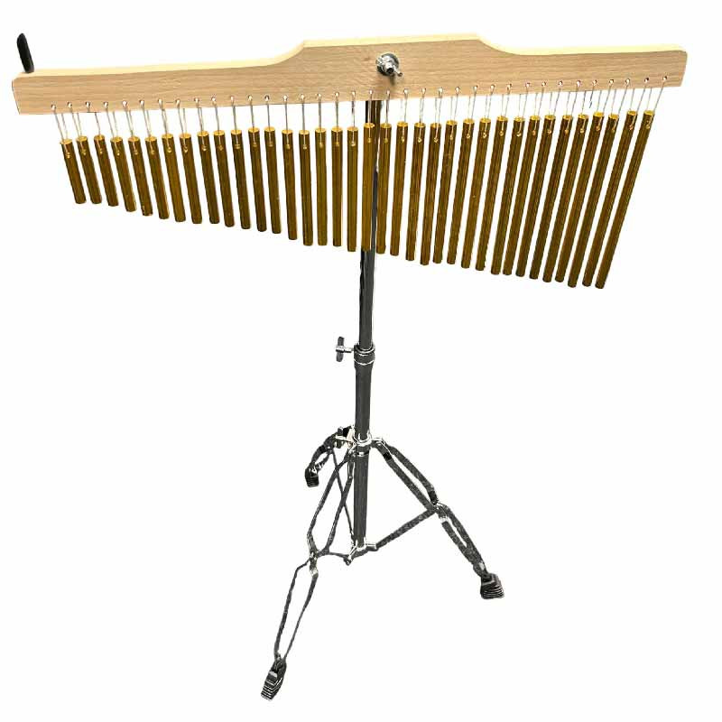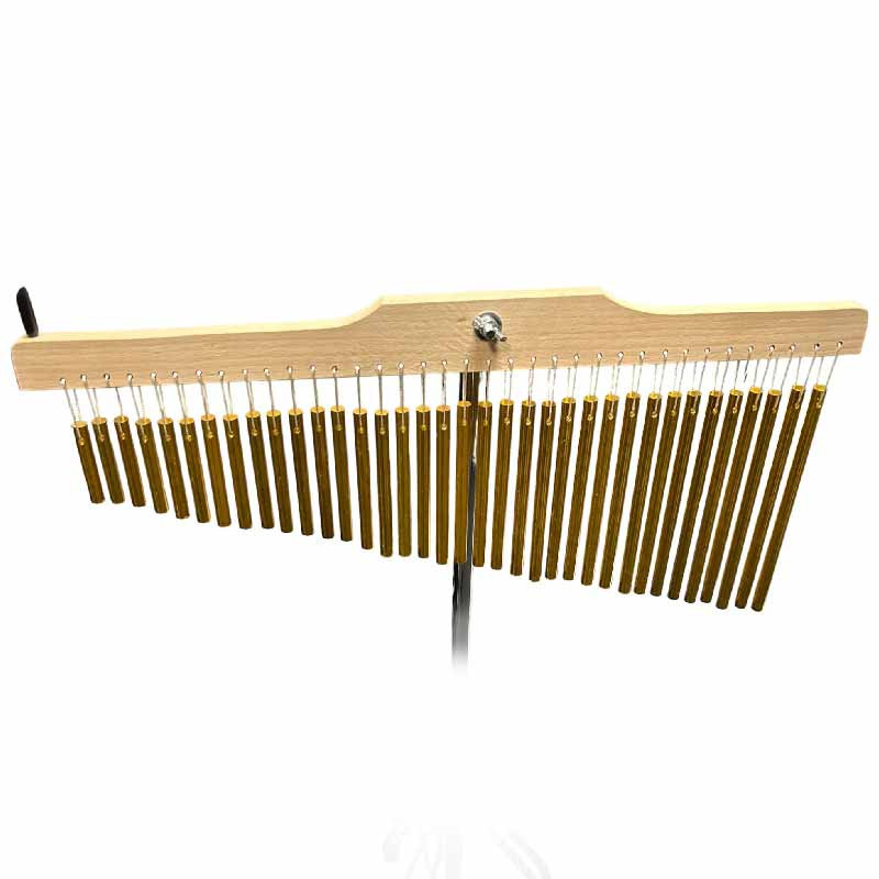 Конструктивно инструмент сделан из деревянной планки, к которой на деликатно натянутых нитях прикреплены алюминиевые трубки. Сочетание дерева и металла не только обеспечивает приятный тактильный контакт, но и создает сбалансированный тембральный отклик: деревянное основание мягко сглаживает верхние обертоны, металлические трубки придают яркости и атаки. Такая конструкция также гарантирует стойкость звука и надежность в использовании на сцене или студии.