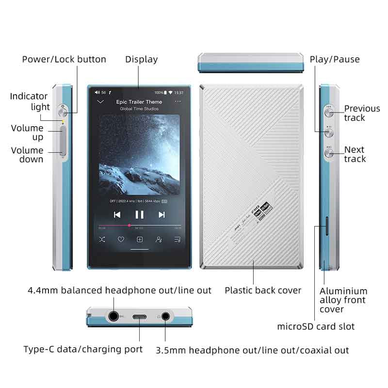 FiiO JM21 имеет новый небесно-голубой дизайн и весит всего 156 г при толщине 13 мм. Благодаря 4.7-дюймовому HD экрану устройство удобно удерживать одной рукой.