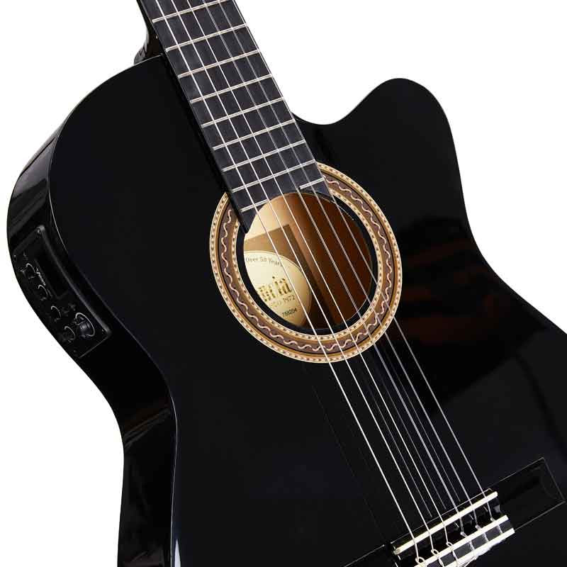 Встроенная электроника и вырез (Cutaway), 3-полосный эквалайзер и хроматический тюнер позволяют легко подключать гитару к усилителю или микшеру. Форма со срезом обеспечивает удобный доступ к верхним строям. Это делает гитару универсальной: она подходит как для акустических занятий, так и для выступлений на сцене или студии.