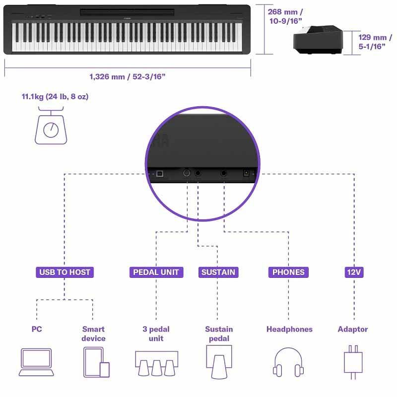 Подключив Yamaha P 145BT piano к специальной программе для цифрового пианино Yamaha Smart Pianist, вы сможете интуитивно выполнять все операции на Piano Yamaha P-145BT с экрана вашего смарт-устройства. Больше нет необходимости получать руководство, чтобы посмотреть, как все работает. При подключении смарт-устройства к музыкальному инструменту для использования приложения вы можете либо использовать кабель, либо подключиться через беспроводную сеть с помощью Yamaha UD-BT01 (продается отдельно; только для iOS).