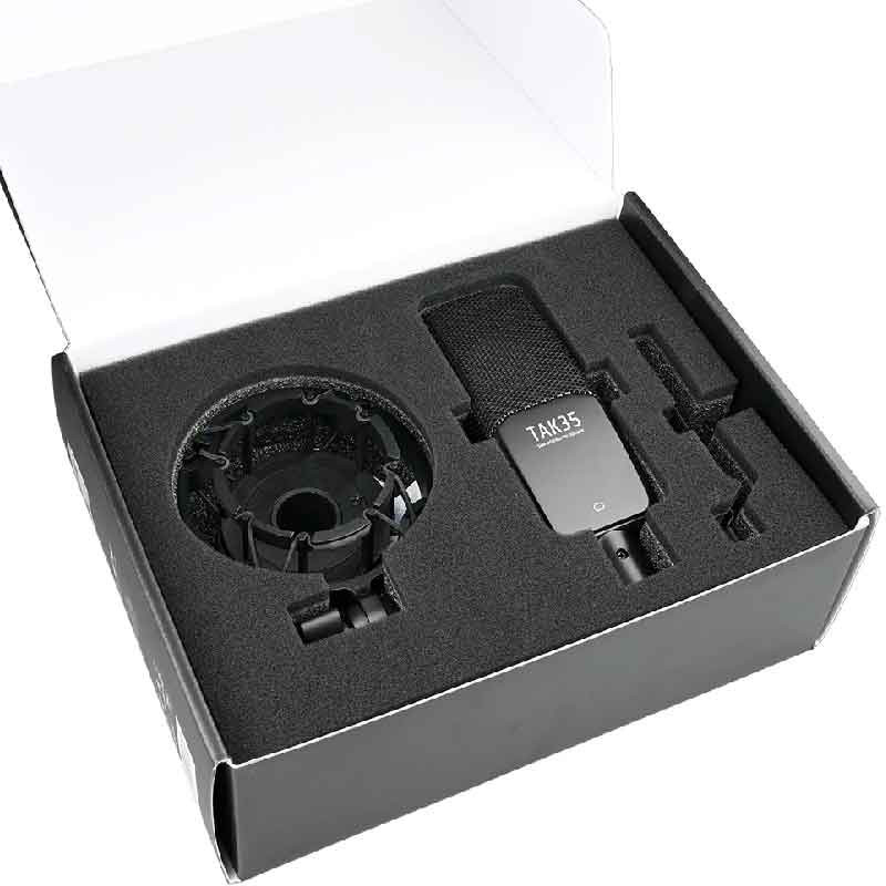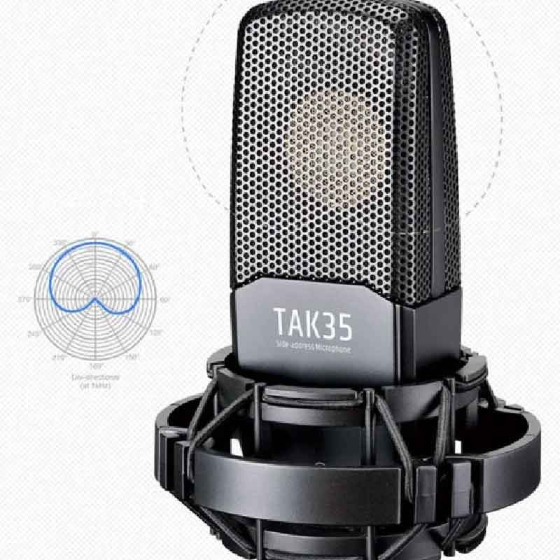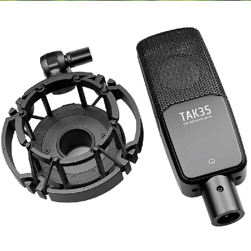 Takstar TAK35 – сбалансированный конденсаторный микрофон, разработанный для мультимедийного контента. Оснащен фирменным позолоченным капсюлем (16 мм), в результате чего пользователю доступно высокое качество записи. Комплектуется шок-маунтом и попфильтром.