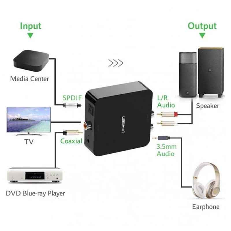 Ugreen Digital to Analog Audio Converter – ЦАП, превращающий оптический или коаксиальный аудиосигнал в аналоговый композитный или стерео. В декодере два входа, к которым подключается источник звука.
