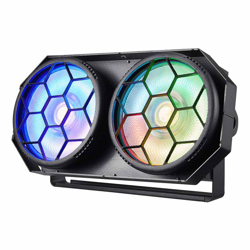 Free Color Magic Flash 2 — це потужний бліндер із комбінованим джерелом світла. Два COB-модулі по 100 Вт забезпечують інтенсивні спалахи, ідеальні для сценічних акцентів і шоу-ефектів, а декоративна RGB-підсвітка створює кольорове сяйво навколо кожного основного світлодіода, підсилюючи візуальний ефект.