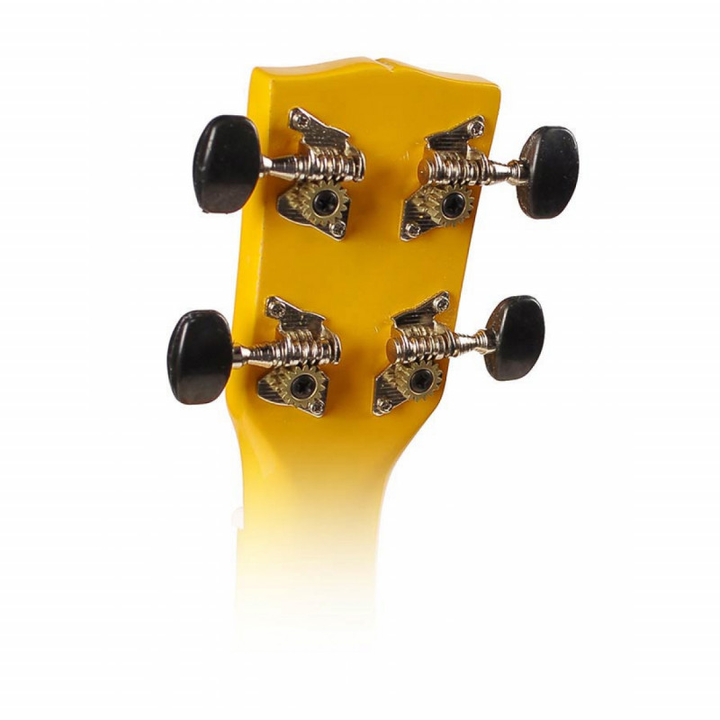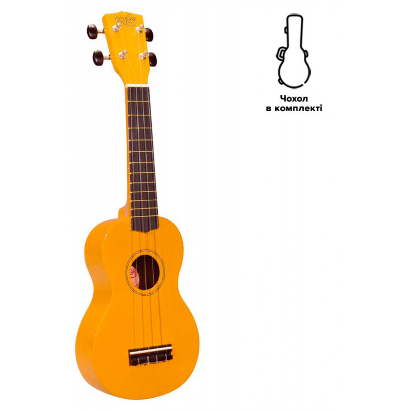 KORALA UKS-30-YE - сопрано укулеле із гітарними колками, чохол у комплекті. Кількість струн: 4, мензура: 346 мм, гітарна колкова механіка. Доступні кольори: синій, зелений, помаранчевий, фіолетовий, червоний, білий, жовтий, чорний, рожевий.