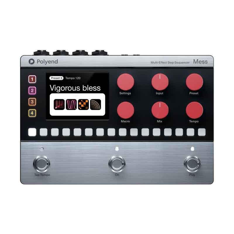 Polyend Mess - гітарний процесор, що може похвалитися 4 незалежними треками з 120+ ефектами, 16-кроковим секвенсором з параметричним управлінням, поліритмія, ймовірність, рандомізація, MIDI-синхронізація, 1000 пресетів + можливість швидкої зміни порядку ефектів.