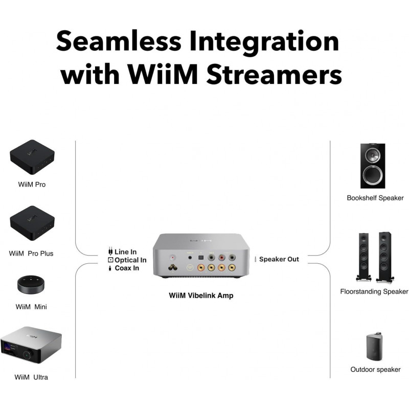 З'єднайте ваш WiiM Mini, Pro, Pro Plus або Ultra з підсилювачем WiiM Vibelink Amp та насолоджуйтесь чистим, потужним та захоплюючим звуком, як ніколи раніше. Підвищуйте якість потокового мовлення з кристально чистими деталями, глибокими басами та об'ємним звучанням.